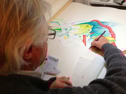 Seit dem 1. Januar 2000 gestaltete ich mit meinem Mann, Emil Steinberger, 20 Jahre lang jede Woche gemeinsam ein sogenanntes "Wochenblatt". Am Montag legten wir ein weisses Blatt auf einen eigens für die Wochenblätter reservierten Zeichentisch. Dann machte einer von uns den ersten Strich oder auch gleich mehrere. Der andere schaute sich bei Gelegenheit die "Vorgabe" an und ergänzte sie nach eigenen Gefühlen. Nie wurde miteinander über eine gewünschte Fortsetzung diskutiert. Immer abwechselnd ergänzte jeder das Vorhandene mit der eigenen Phantasie. Am Sonntag war immer strikter Abgabetag. Dann wurde gemeinsam signiert. Es unterzeichnete immer derjenige zuerst, der das Blatt begonnen hatte.